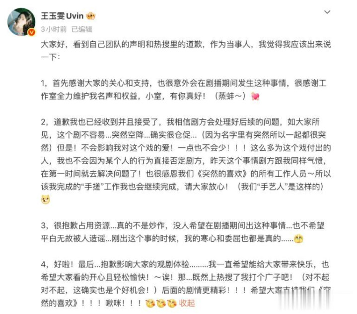 据悉,因为《突然的喜欢》剧方合作的宣传团队违反了微博宣传规定,却甩锅给王玉雯,甚至私下向播出平台优酷造谣抹黑王玉雯的人品,因而惹怒王玉雯。 事后《突然的喜欢》剧方火速发道歉声明,王玉雯本人也发文回应接受道歉,但表明出事的第一时间寒心和委屈也都是真的,令粉丝心疼不已。