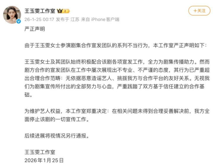 怎料《突然的喜欢》刚开播不久,王玉文工作室于25日凌晨无预警发声明,宣布将停止一切与《突然的喜欢》的宣传,令网友错愕不已,火速登上热搜。