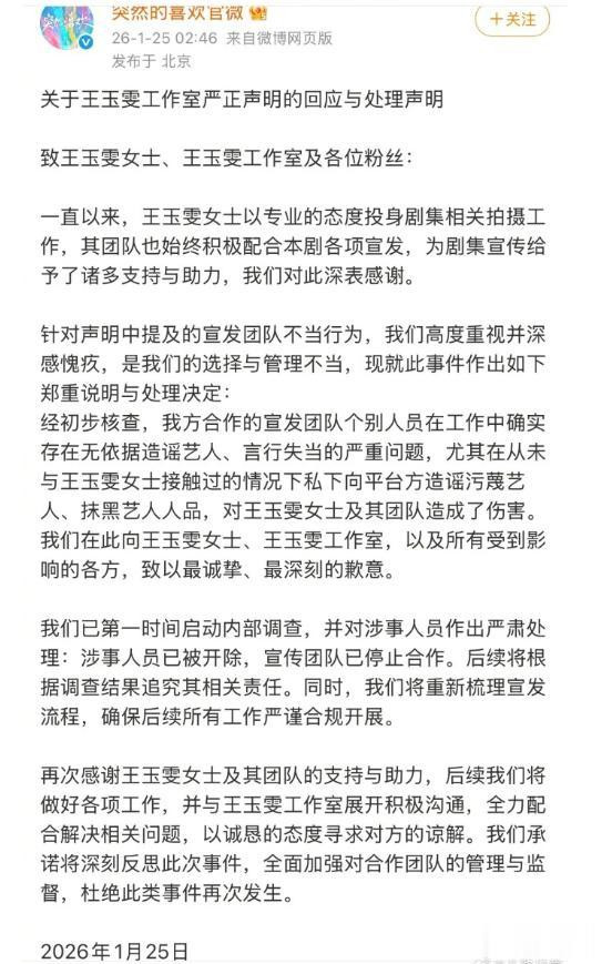 王玉雯工作室的声明发布约2小时后,《突然的喜欢》剧方便火速发布道歉声明,承认合作的宣传团队确实存在造谣艺人、言词失当等严重问题,目前涉事艺人已被开除,宣传团队也停止合作,将重新梳理虚传流程。
