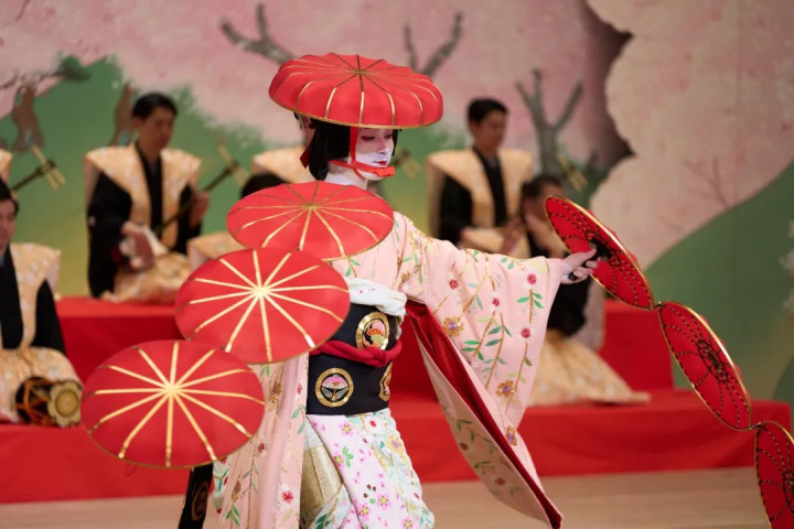 菊男与朋友上台表演了一段歌舞伎助兴。