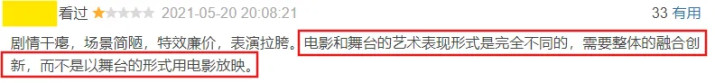 就像一些观众吐槽的,只是把舞台表演搬进了电影院,形式改变、技术升级,内容却并无创新。